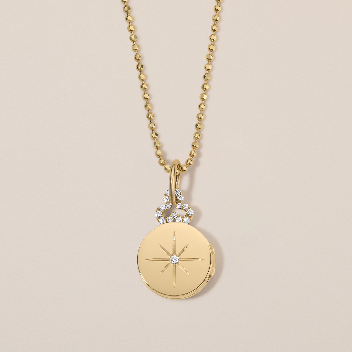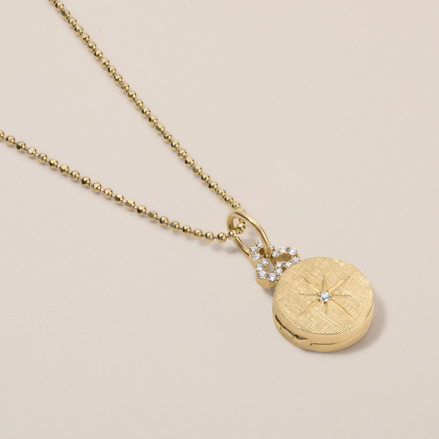 Inspired by looking up at the night sky, our Mini North Star Locket features two solitaire diamond stars—one in front and one in back, shiny on one side, our signature florentine on the other. A favorite gift for graduates and new mothers who fill it with photos of those who give their life meaning and direction.