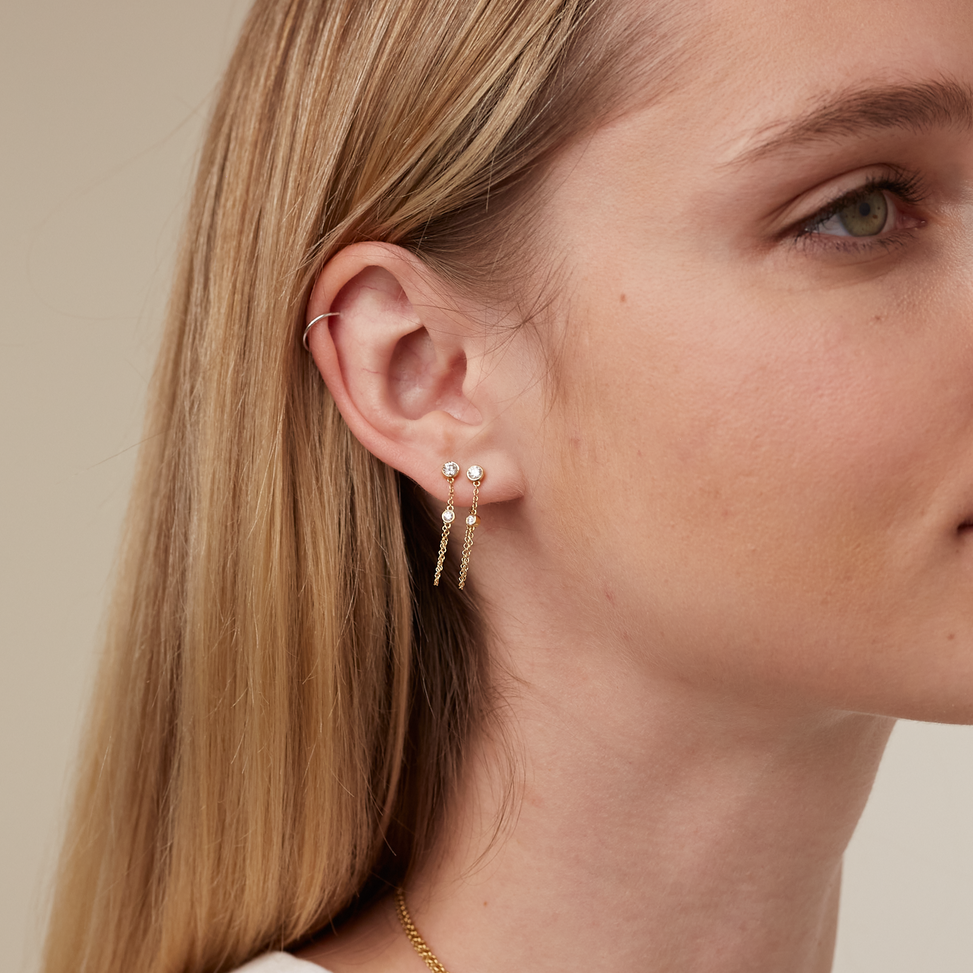 Diamond bezel-set chain loop earrings are elegant, yet subversive. The perfect hybrid between a stud, a hoop, and a dangling earring, our Classic Chain Earrings' second-skin feel makes ideal for glittering on the go.