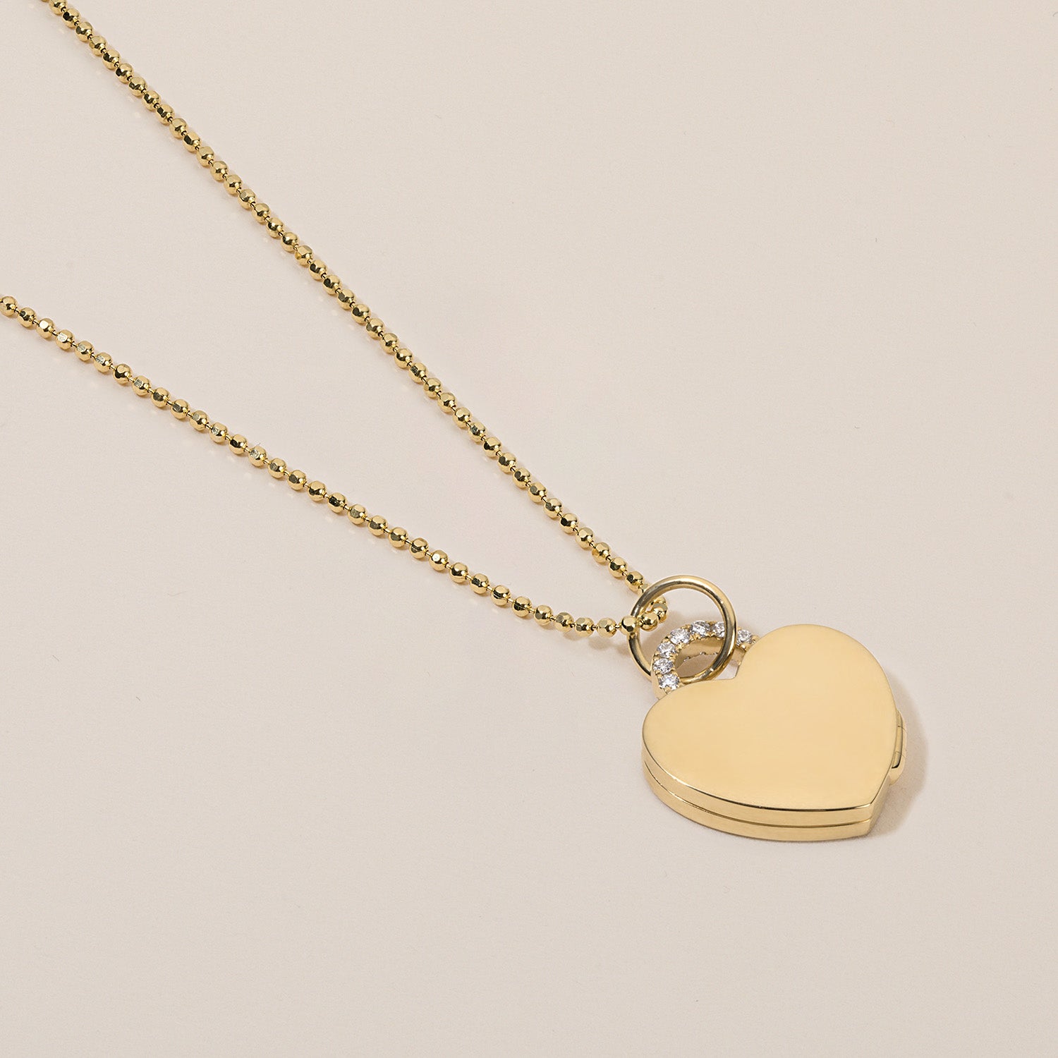 The Classic Evermore Heart Locket is a keepsake to hold close, forever. A soft heart shaped in brilliant gold, shiny on one side, our signature florentine on the other. The diamond arch shimmers like a love without end.