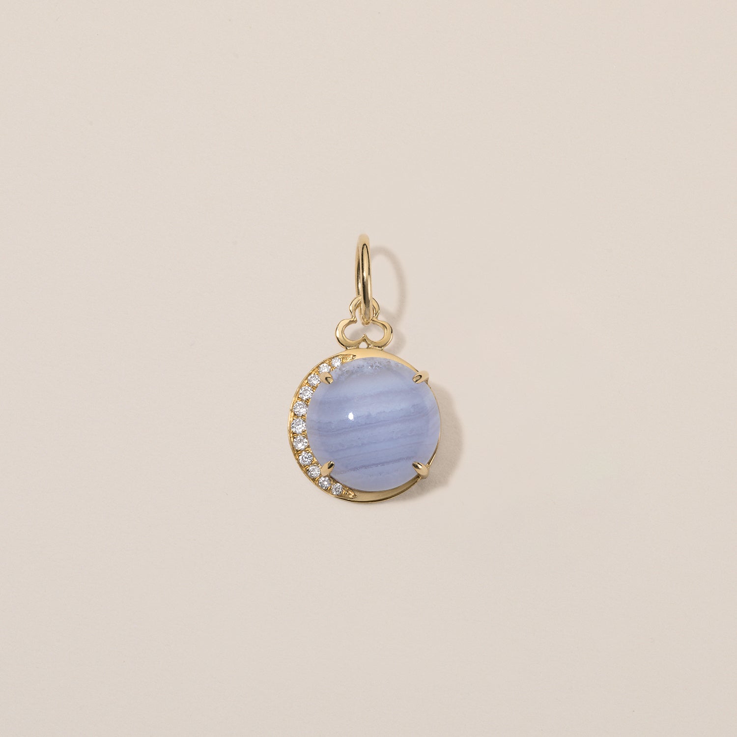 Reach for the moon and land among the stars with our Blue Lace Agate Moon Charm. Crafted from 18k gold, the charm showcases a gorgeous cabochon center stone. Look closely and you'll notice that the diamond half halo is actually a crescent moon.