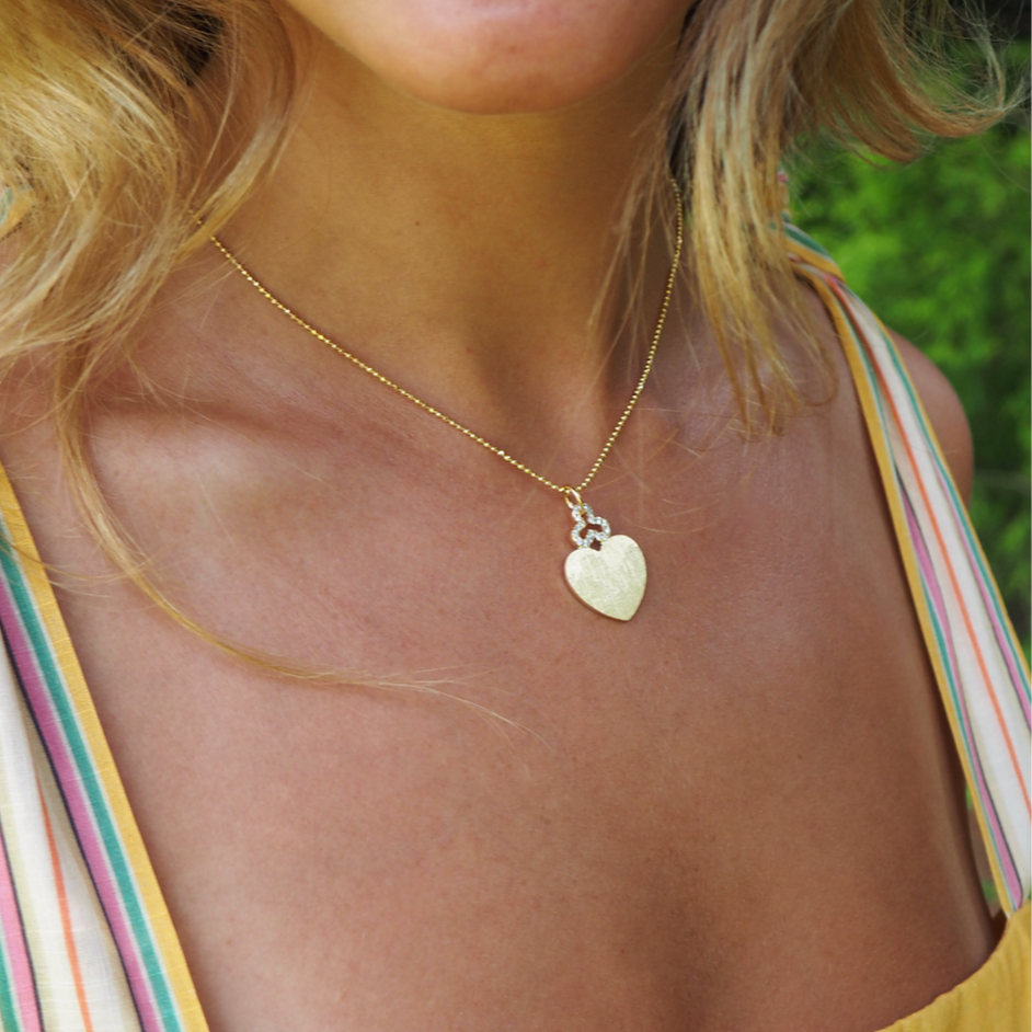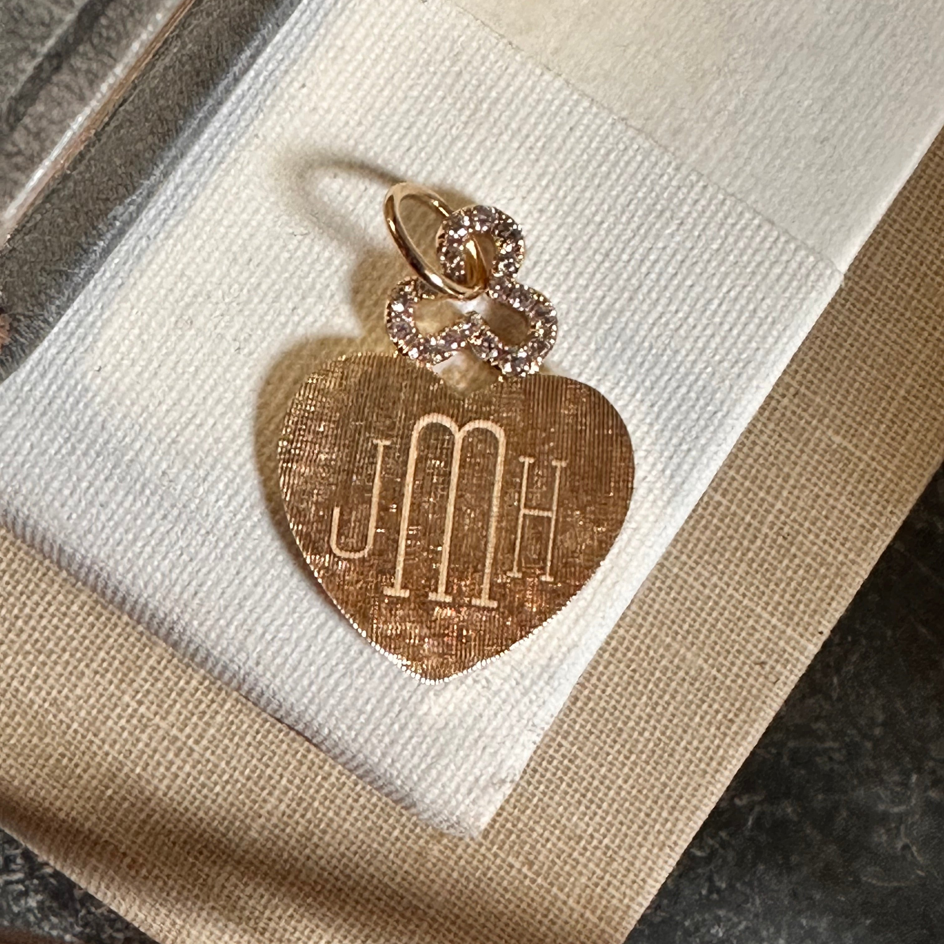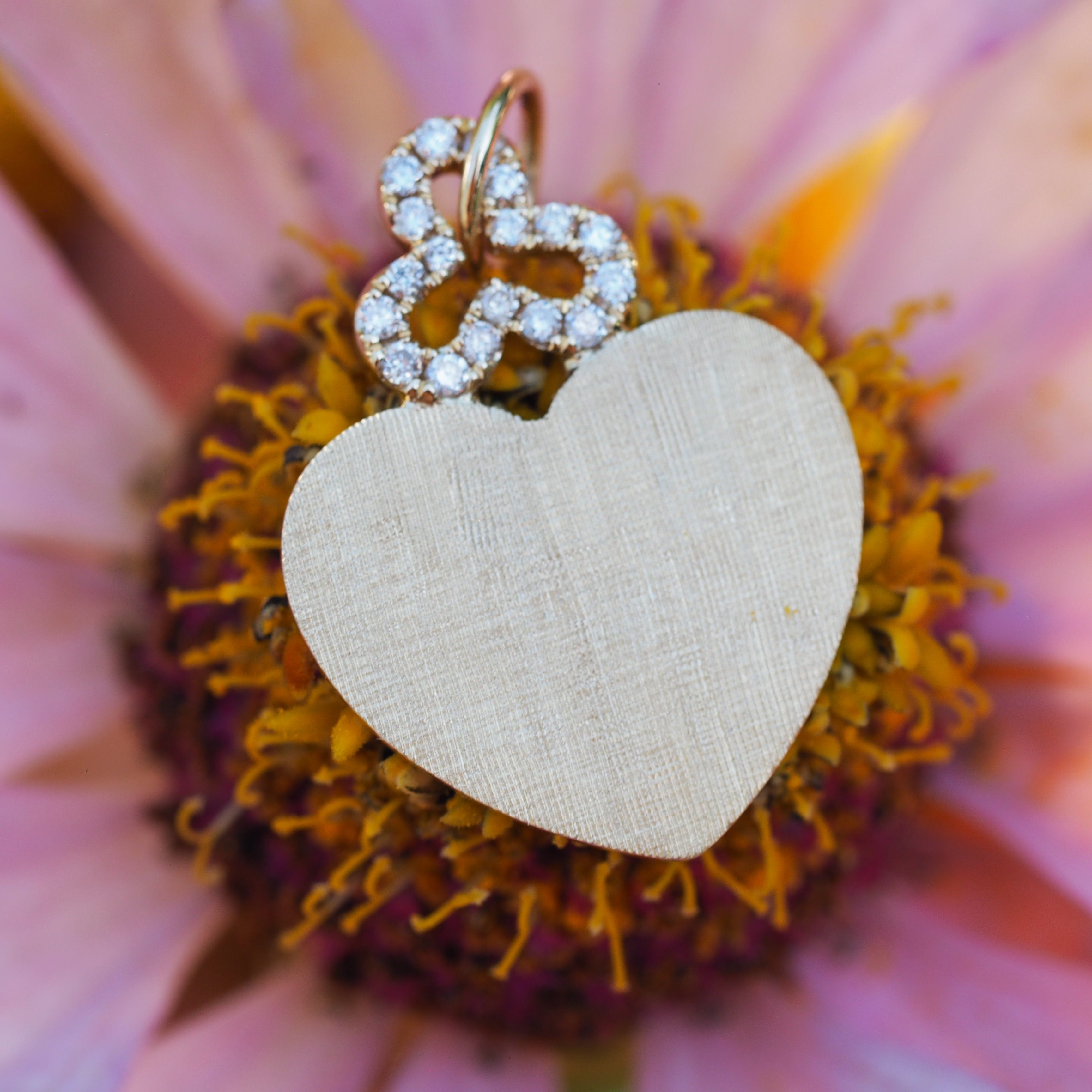 Adorn your loved one with our beautiful Diamond Heart Charm, crafted in an exquisite Florentine finish. Sparkling diamond accents rest atop a shining heart backdrop, our signature trefoil design emulating a glittering crown—fit for a queen of hearts.