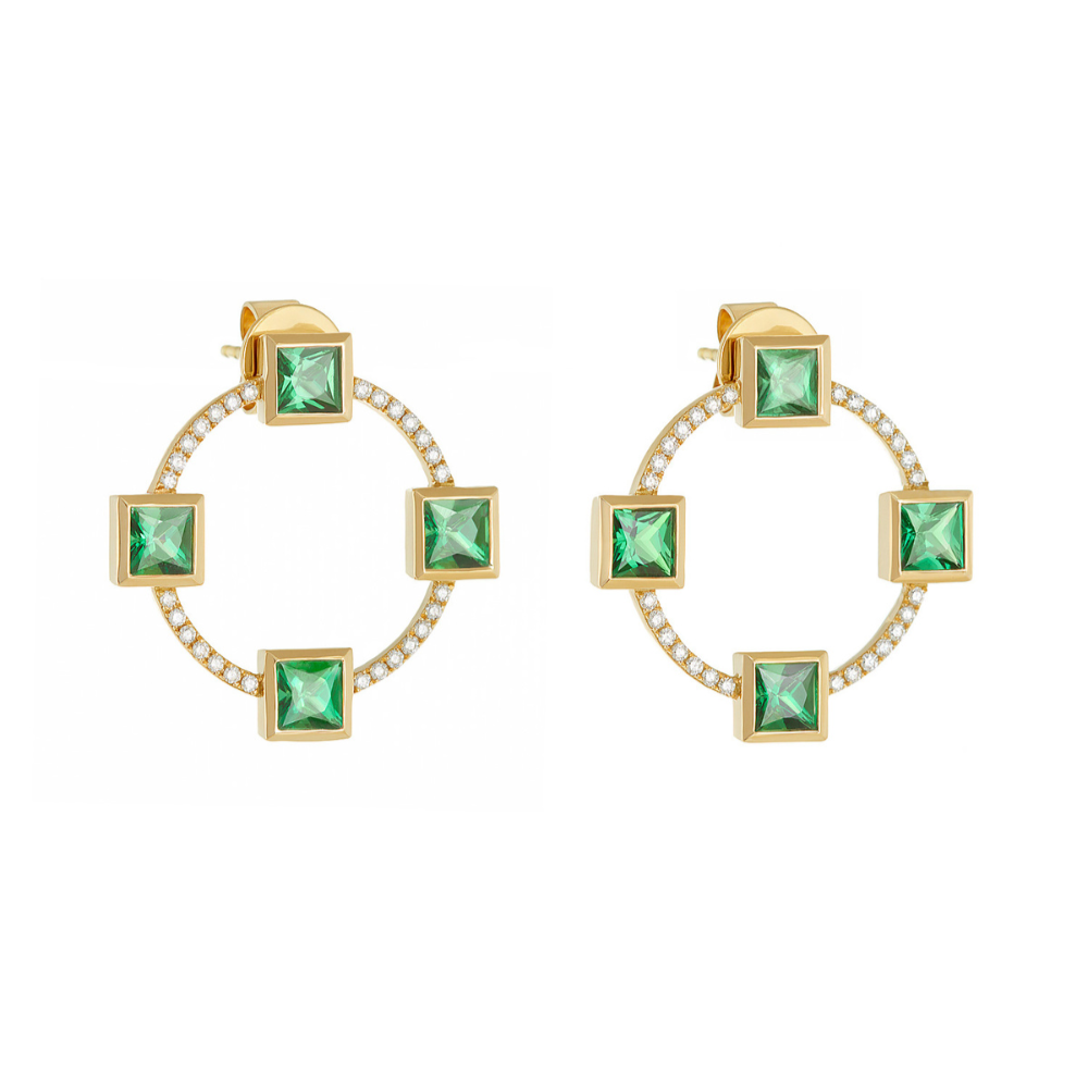 Our Green Garnet Club Earrings in 18k Gold feature 4 square green garnets on a pavé diamond hoop. The special shape of these earrings is inspired by niche architecture: They can be thought of as the unique shape of a window, or like a porthole in a luxury cabin on a very special cruise. Another way of viewing the world, of entering something special and of belonging.