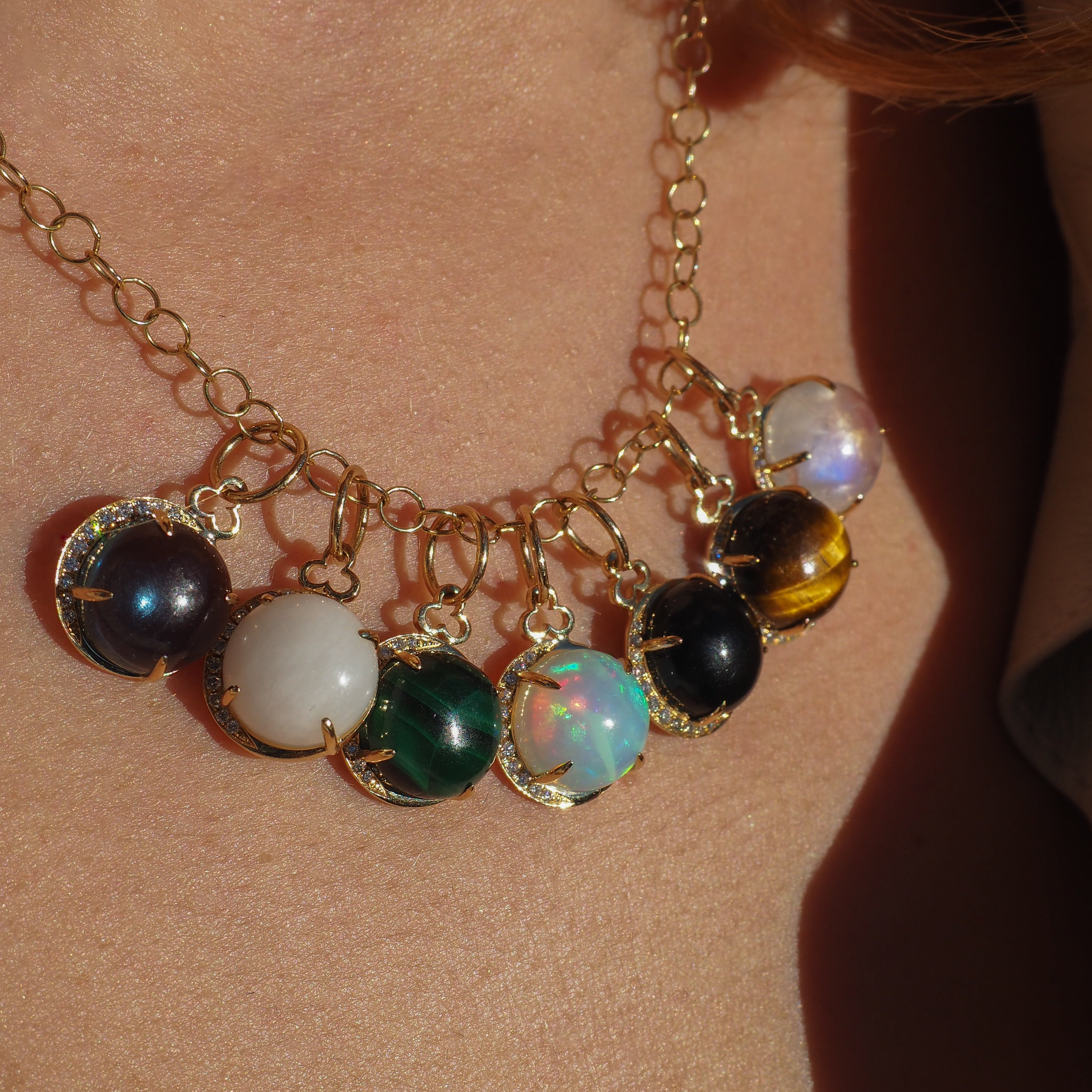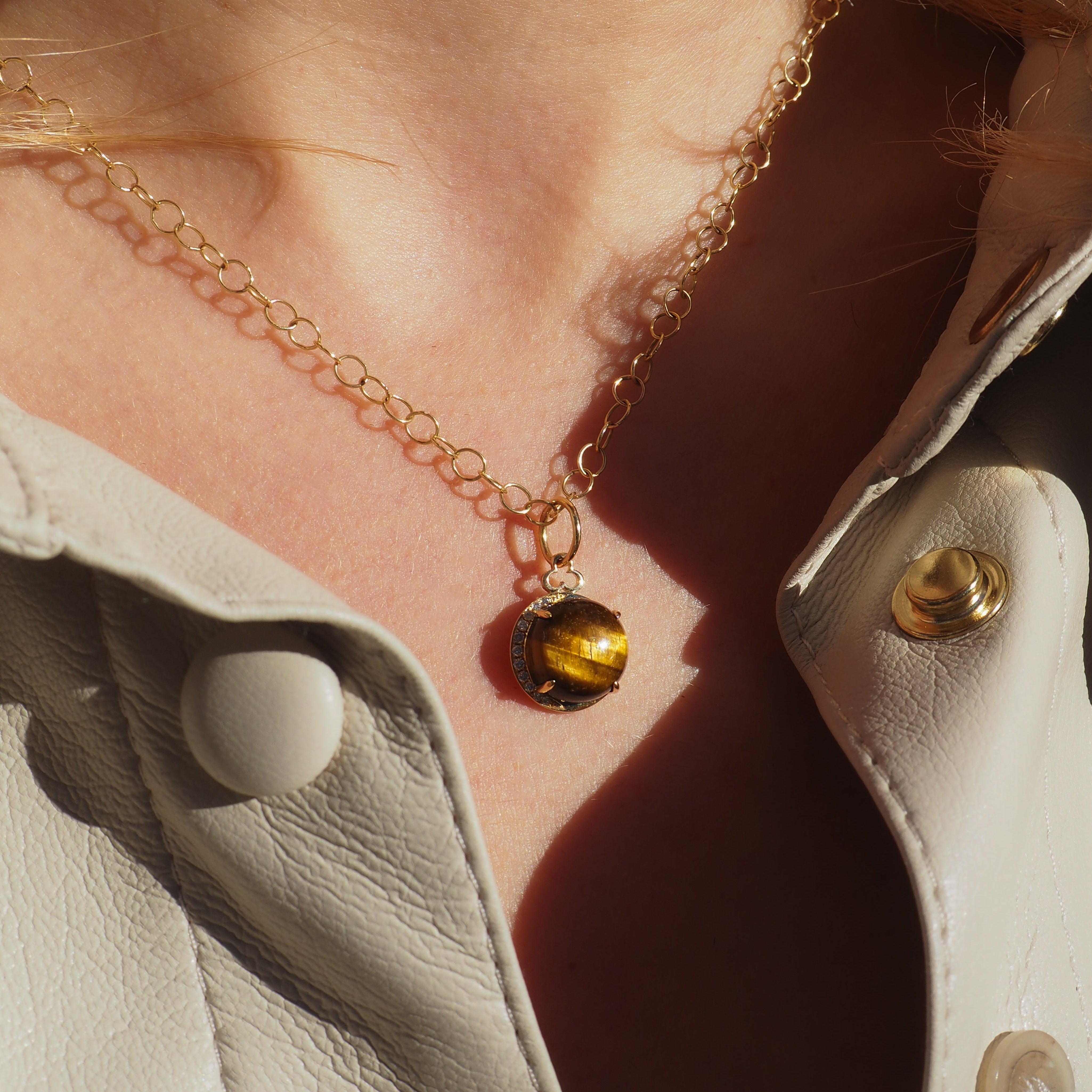 Reach for the moon and land among the stars with our Tiger's Eye Moon Charm. Crafted from 18k gold, the charm showcases a gorgeous cabochon center stone. Look closely and you'll notice that the diamond half halo is actually a crescent moon.
