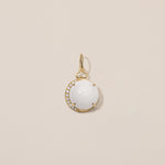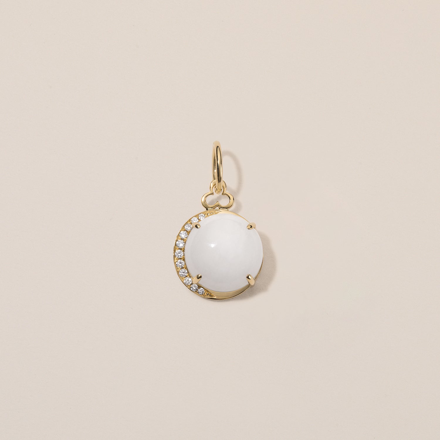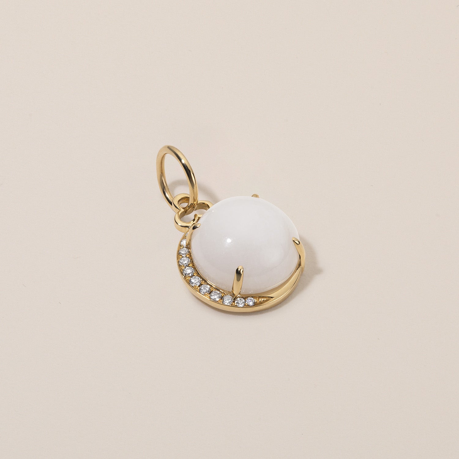 Reach for the moon and land among the stars with our White Agate Moon Charm. Crafted from 18k gold, the charm showcases a gorgeous cabochon center stone. Look closely and you'll notice that the diamond half halo is actually a crescent moon.
