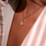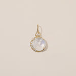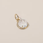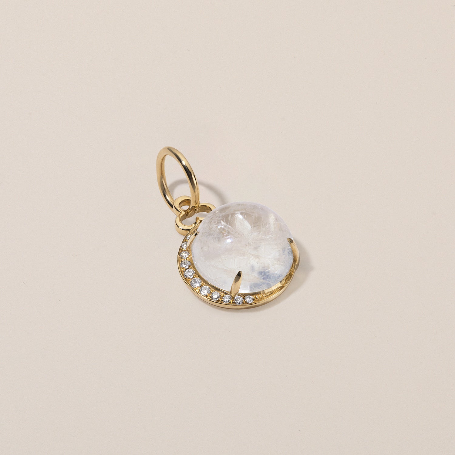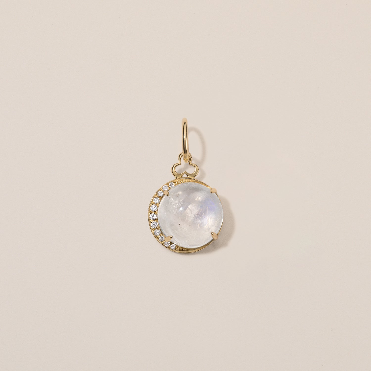 Reach for the moon and land among the stars with our Rainbow Moonstone Moon Charm. Crafted from 18k gold, the charm showcases a gorgeous cabochon center stone. Look closely and you'll notice that the diamond half halo is actually a crescent moon.