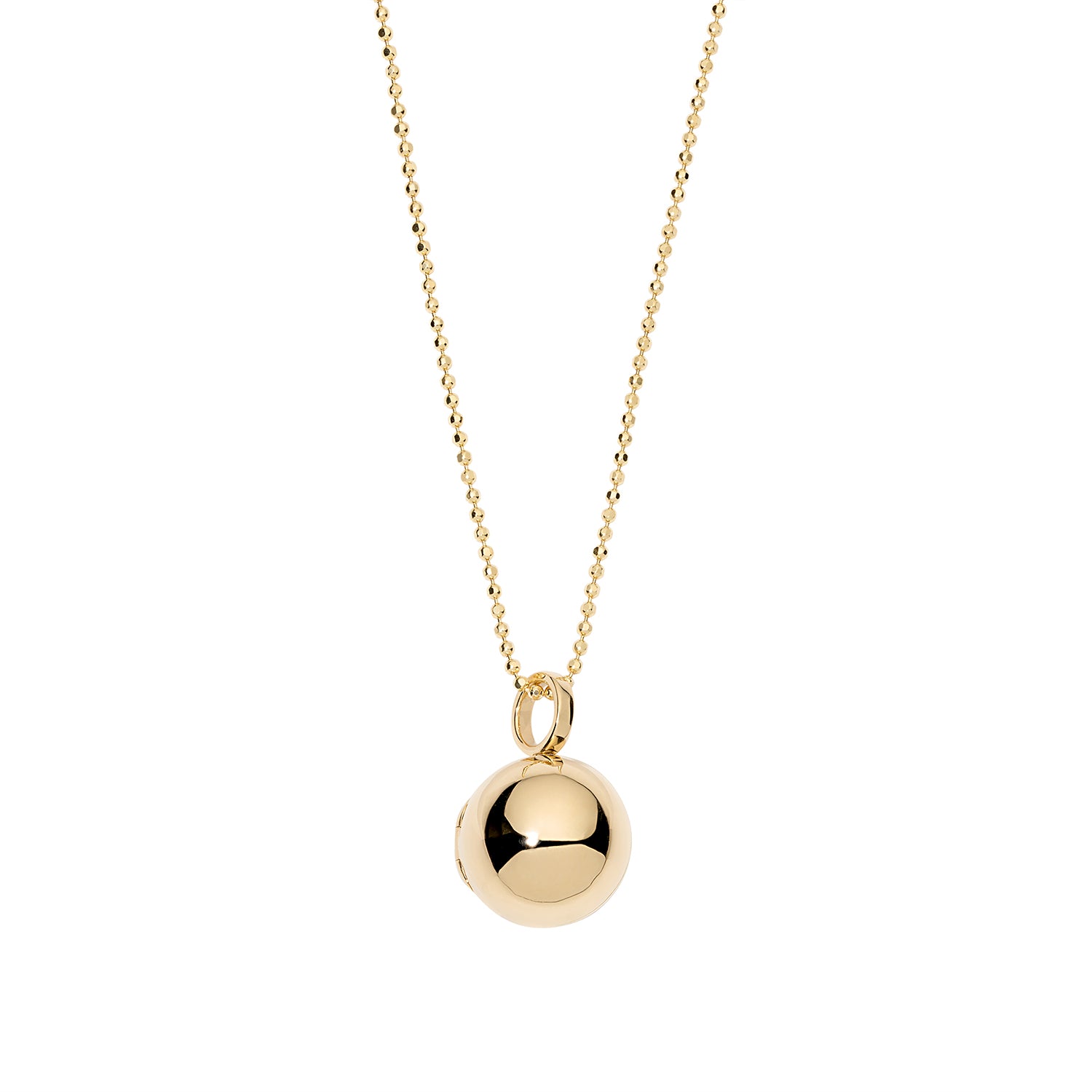 The Halo Ball Locket — a perfect sphere of polished gold, luminous from every angle. Sleek and sculptural, its seamless form protects what matters most, an emblem of strength and perseverance.