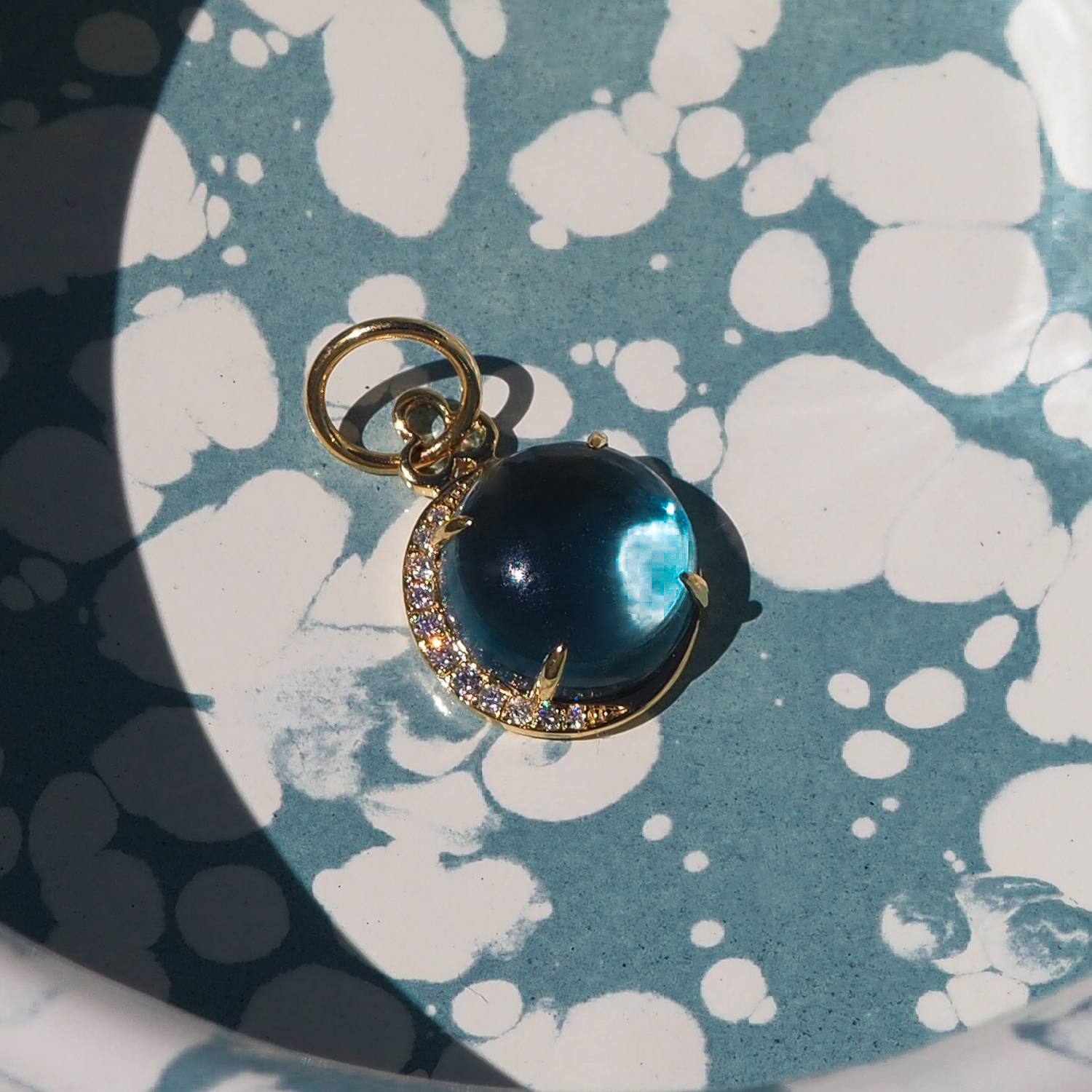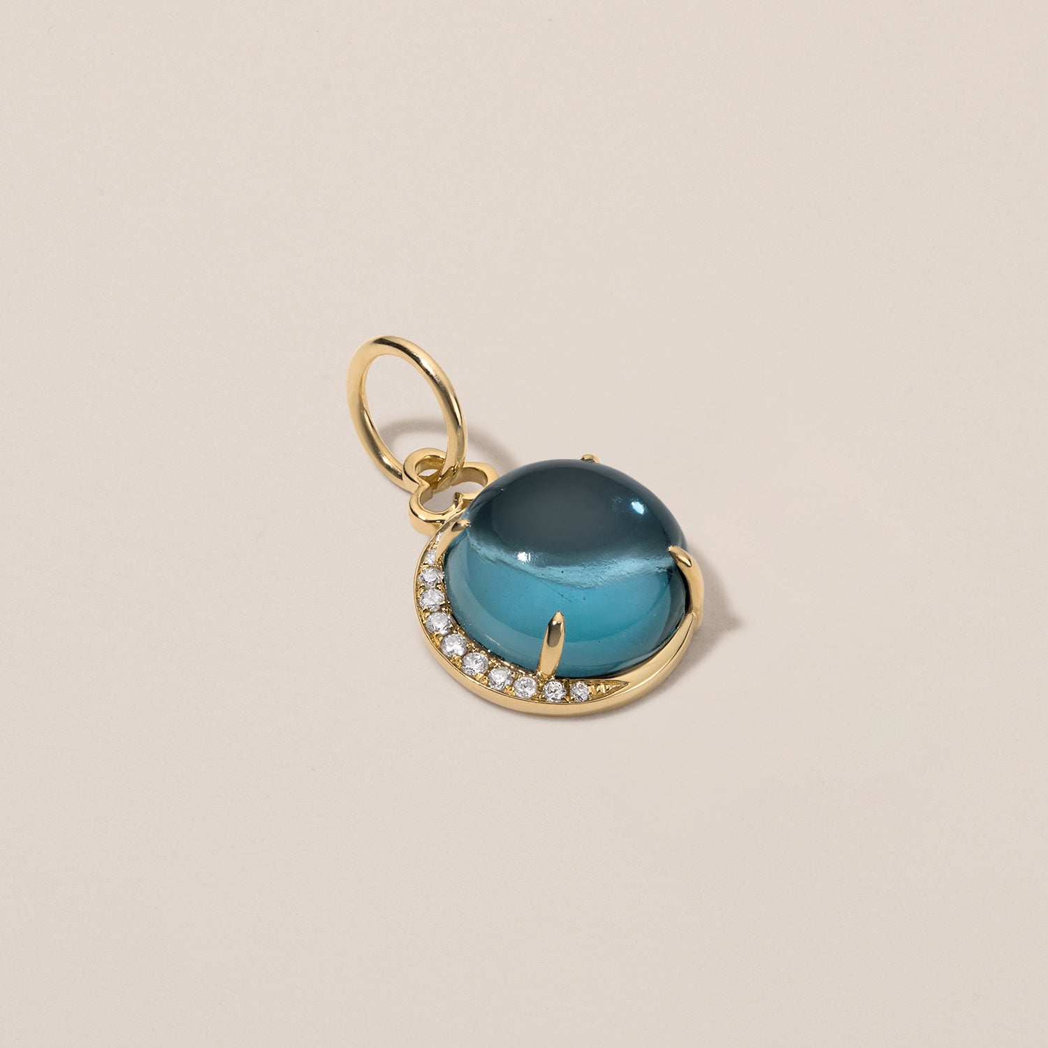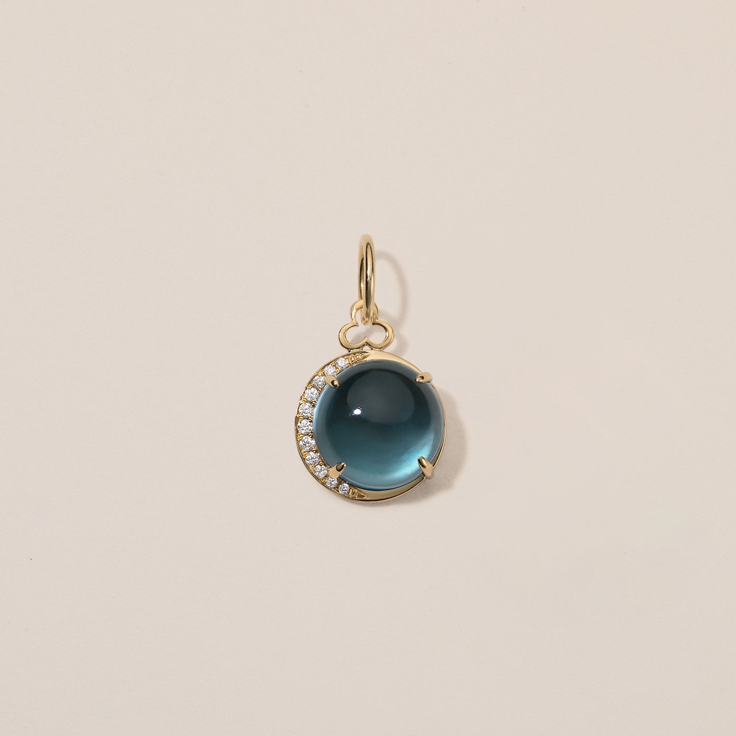 Reach for the moon and land among the stars with our London Blue Topaz Moon Charm. Crafted from 18k gold, the charm showcases a gorgeous cabochon center stone. Look closely and you'll notice that the diamond half halo is actually a crescent moon.
