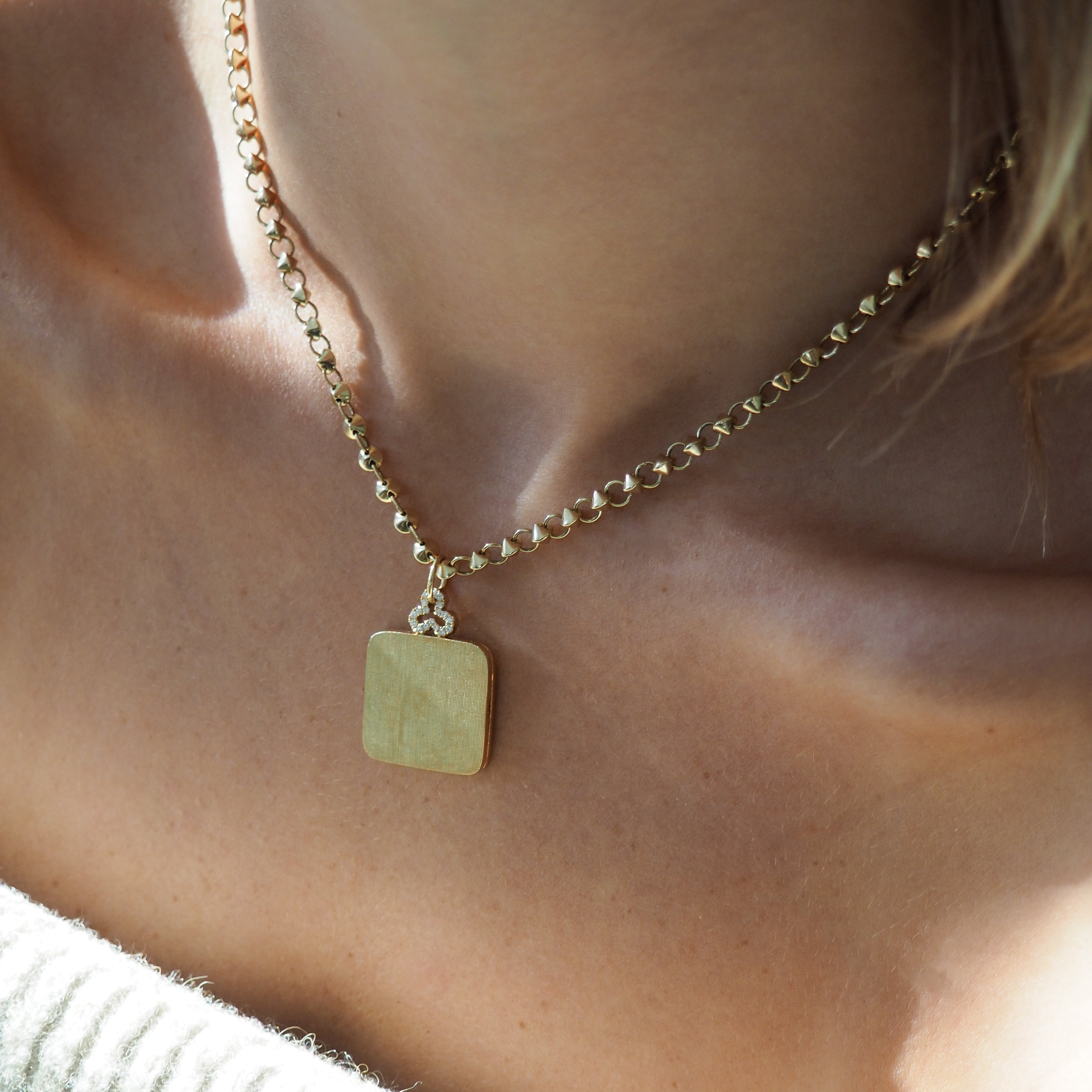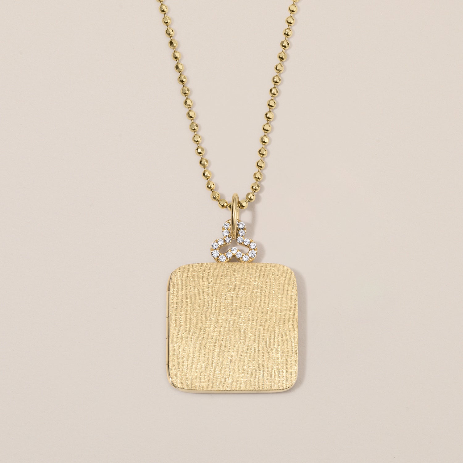 Our Medium Diamond Trefoil Pillow Locket invites the light to pour in, creating a personal sanctuary full of mesmerizing shadows and reflections. Customize it with your own monogram, mantra, or mark—the perfect gift to self. A piece of 'forever jewelry' you'll enjoy wearing every day and look forward to handing down for generations to come.