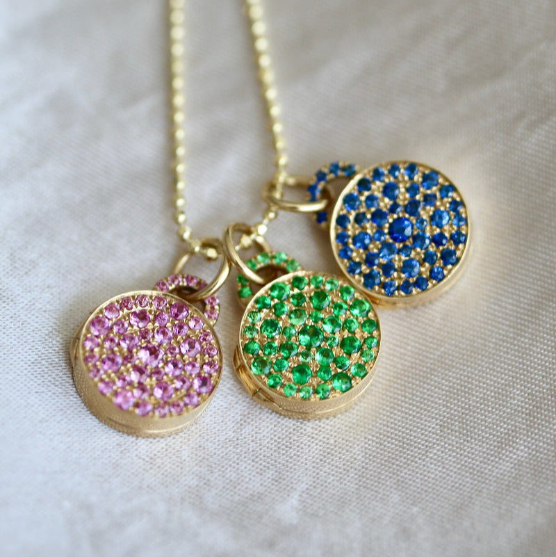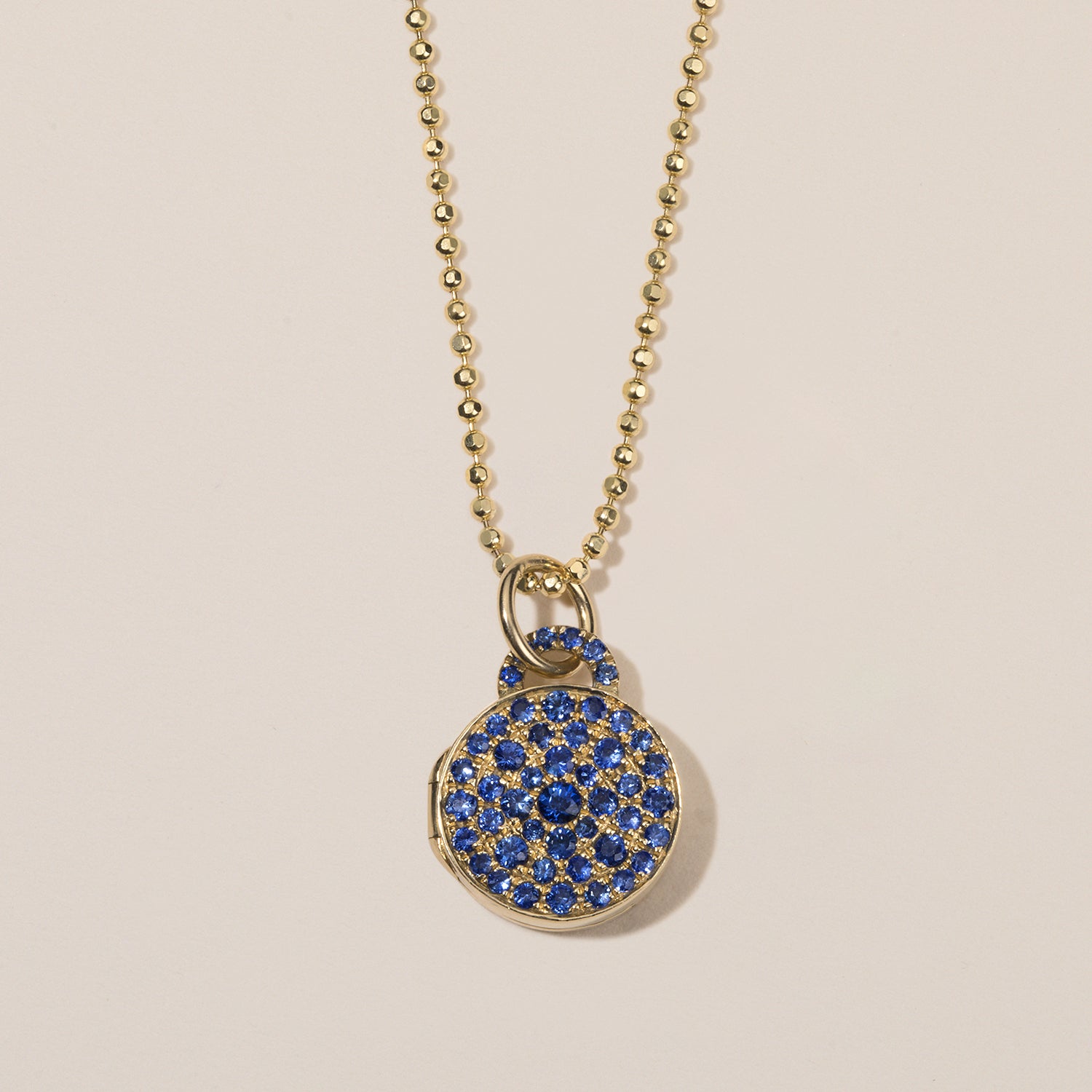 The Sugar Locket—dusted in brilliant pavé sapphires, designed to look a luminous coating of sugar. Its delicate round silhouette shimmers with playful decadence, capturing the spirit of whimsy in bite sized perfection.